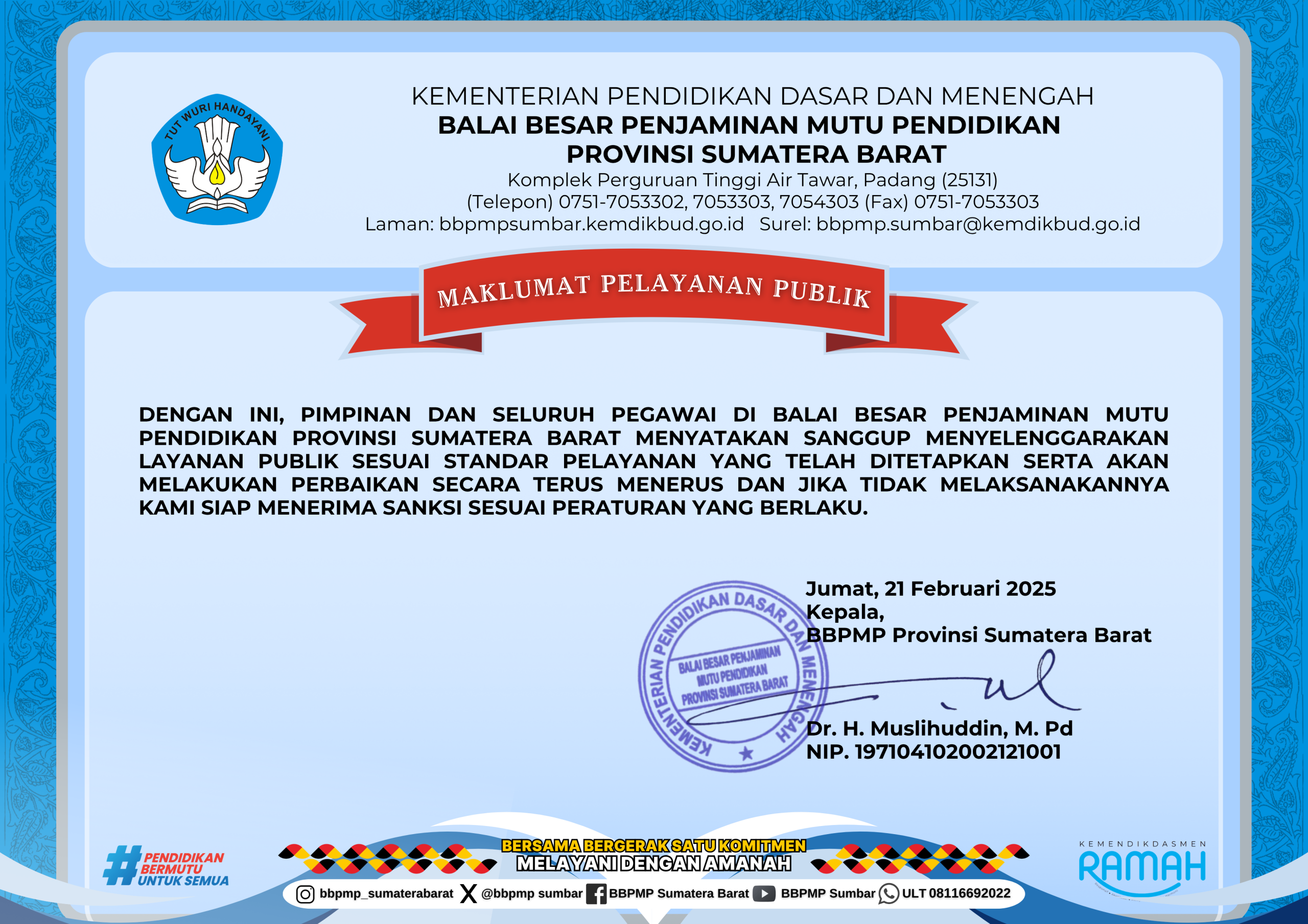 tentang Maklumat Pelayanan di Balai Besar Penjaminan Mutu Pendidikan Provinsi Sumatera Barat, selengkapnya